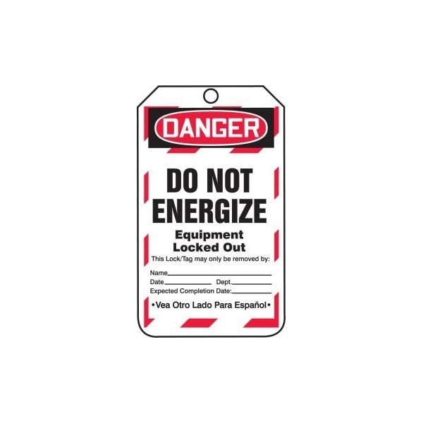 Safety Tags, DANGER DO NOT ENERGIZE EQUIPMENT LOCKED OUT Bilingual Spanish, 5.75in x 3.25in, RP-Plastic, 5PK