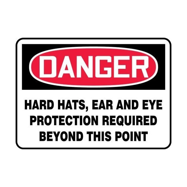 Accuform Danger Safety Sign, Header DANGER, Text Legend, Legend HARD HATS, EAR AND EYE PROTECTION REQUIRED BEYOND THIS POINT, Plastic, 7 in Height, 10 in Width, RedBlack on white LegendBackground