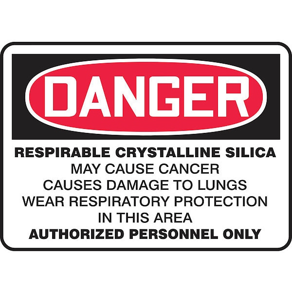 Danger Sign, Horizontal Rectangle, Number of Printed Sides 1, English, Sign Format Traditional OSHA, Sign Legend Respirable Crystalline Silica May Cause Cancer Causes Damage To Lungs Wear Respiratory Protection In This Area Authorized Personnel Only, Sign Legend Background Color White, Sign Legend Style Text
