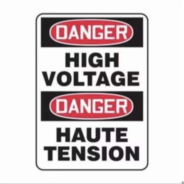 Accuform Danger Sign, Bilingual, Header DANGER, Text Legend, Legend HIGH VOLTAGEHAUTE TENSION, 6 mil Adhesive DuraVinyl, 14 in Height, 10 in WidthSafety Signs identify and indicate potential, type, and degree of hazards that may lead to accidental injury or property damage Duallayered Adhesive DuraVinyl delivers exceptional flexibility and performance, outperforming standard vinyl Printed image is protected by a highgloss UV protective coating Adhesive DuraVinyl is durable, even in the toughest indoor and outdoor conditions, and adheres to most smooth, curved, and irregular surfaces