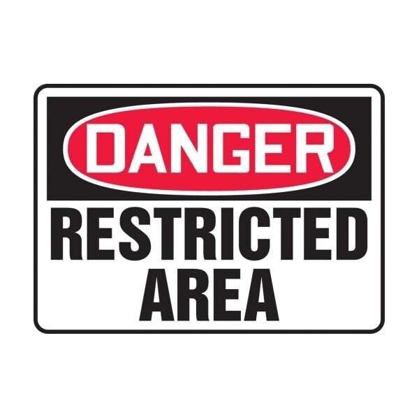 Accuform Danger Sign, Header DANGER, Text Legend, Legend RESTRICTED AREA, 4 mil Adhesive Vinyl, Adhesive Surface Mounting, 7 in Height, 10 in Width, Black on white SignWhite on BlackRed Header LegendBackgroundSafety Signs identify and indicate potential, type and degree of hazards that may lead to accidental injury or property damage Adhesive Vinyl is the ideal choice for a variety of indoor and sheltered outdoor, marking needs Easily mounts to all curved areas such as pipes, poles and secondary containers Adhesive Vinyl signs feature a printed matte surface, moistureresistance and scored backing for quick peeloff and application