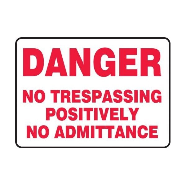 Accuform Danger Sign, Header DANGER, Text Legend, Legend NO TRESPASSING POSITIVELY NO ADMITTANCE, 004 in Aluminum, Hole Mounting, 10 in Height, 14 in Width, Red on white LegendBackgroundSafety Signs identify and indicate potential, type and degree of hazards that may lead to accidental injury or property damage Aluminum signs withstand washdowns, harsh elements, abusive conditions and feature good chemical, abrasion and impact resistance Aluminum is excellent for indoor and outdoor usage, making it ideal for a wide variety of industrialstrength applications
