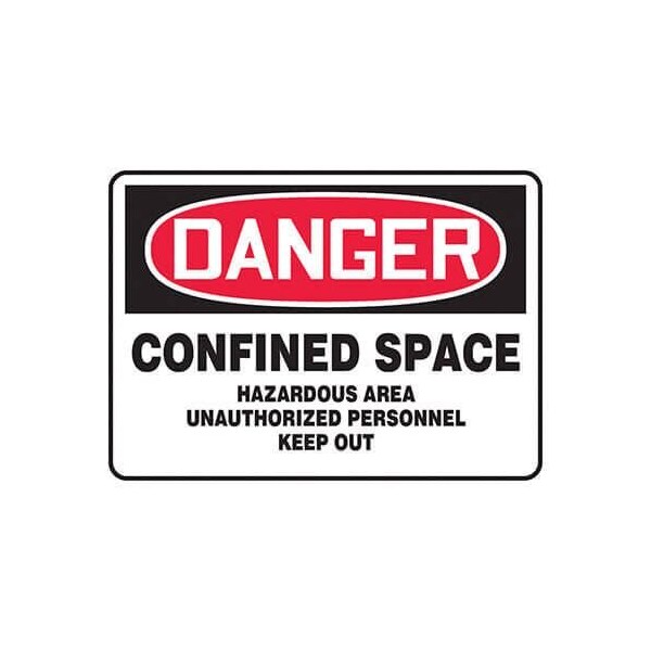 Accuform Danger Sign, Header DANGER, Text Legend, Legend CONFINED SPACE HAZARDOUS AREA UNAUTHORIZED PERSONNEL KEEP OUT, 0055 in Plastic, 7 in Height, 10 in Width, RedBlack on white LegendBackgroundSafety Signs identify and indicate potential, type and degree of hazards that may lead to accidental injury or property damage Plastic signs are semiflexible, made with 50 recycled content and ideal for indoor and shortterm, sheltered outdoor environments Plastic signs feature good impact resistance, UV inhibitors and enough flex to mount on slightly curved areas