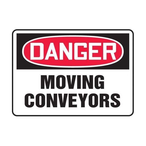 Accuform Danger Sign, Header DANGER, Text Legend, Legend MOVING CONVEYORS, 4 mil Adhesive Vinyl, Surface Mounting, 10 in Height, 14 in Width, RedBlack on white LegendBackgroundSafety Signs identify and indicate potential, type and degree of hazards that may lead to accidental injury or property damage Adhesive Vinyl is the ideal choice for a variety of indoor and sheltered outdoor, marking needs Easily mounts to all curved areas such as pipes, poles and secondary containers Adhesive Vinyl signs feature a printed matte surface, moistureresistance and scored backing for quick peeloff and application