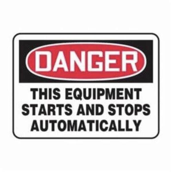 Accuform Danger Sign, Header DANGER, Text Legend, Legend THIS EQUIPMENT STARTS AND STOPS AUTOMATICALLY, 6 mil Adhesive DuraVinyl, 10 in Height, 14 in WidthSafety Signs identify and indicate potential, type, and degree of hazards that may lead to accidental injury or property damage Duallayered Adhesive DuraVinyl delivers exceptional flexibility and performance, outperforming standard vinyl Printed image is protected by a highgloss UV protective coating Adhesive DuraVinyl is durable, even in the toughest indoor and outdoor conditions, and adheres to most smooth, curved, and irregular surfaces