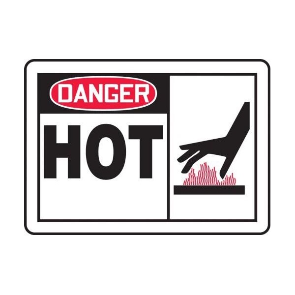 Accuform Danger Sign, DANGER Header, TextSymbol Legend, HOT GRAPHIC Legend, 004 in Aluminum, 10 in Height, 14 in Width, RedBlack on white LegendBackgroundSafety Signs identify and indicate potential, type and degree of hazards that may lead to accidental injury or property damage Aluminum signs withstand washdowns, harsh elements, abusive conditions and feature good chemical, abrasion and impact resistance Aluminum is excellent for indoor and outdoor usage, making it ideal for a wide variety of industrialstrength applications