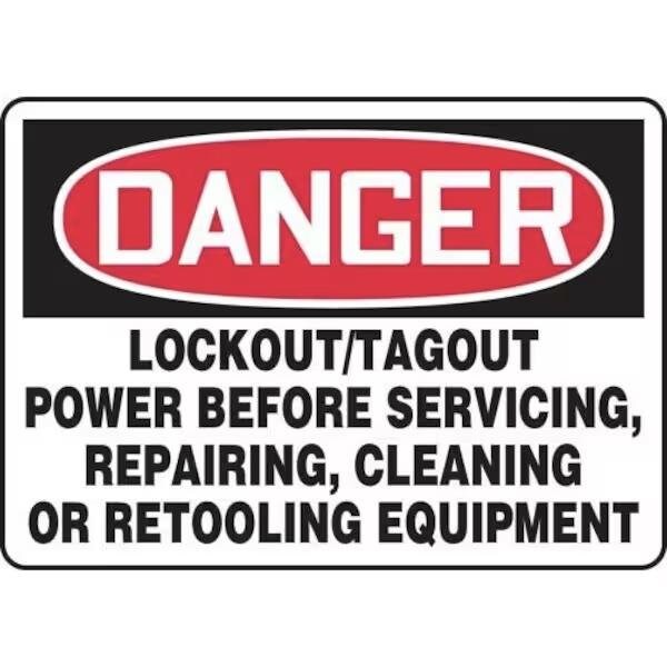 Accuform Danger Sign, Header DANGER, Text Legend, Legend LOCKOUTTAGOUT POWER BEFORE SERVICING, REPAIRING, CLEANING OR RETOOLING EQUIPMENT, 4 mil Vinyl, 10 in Height, 14 in WidthSafety Signs identify and indicate potential, type, and degree of hazards that may lead to accidental injury or property damage Adhesive Vinyl is the ideal choice for a variety of indoor, and sheltered outdoor, marking needs Easily mounts to all curved areas such as pipes, poles, and secondary containers Adhesive Vinyl signs feature a printed matte surface, moistureresistance, and scored backing for quick peeloff and application