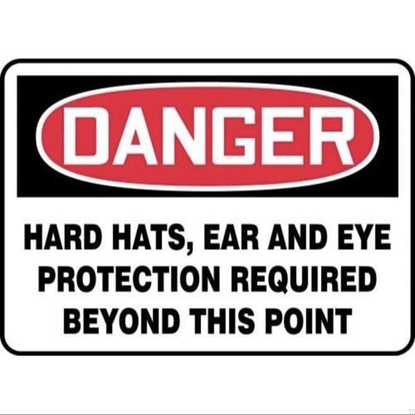 Accuform Danger Sign, Header DANGER, Text Legend, Legend HARD HATS, EAR AND EYE PROTECTION REQUIRED BEYOND THIS POINT, 6 mil Adhesive DuraVinyl, 10 in Height, 14 in WidthSafety Signs identify and indicate potential, type, and degree of hazards that may lead to accidental injury or property damage Duallayered Adhesive DuraVinyl delivers exceptional flexibility and performance, outperforming standard vinyl Printed image is protected by a highgloss UV protective coating Adhesive DuraVinyl is durable, even in the toughest indoor and outdoor conditions, and adheres to most smooth, curved, and irregular surfaces