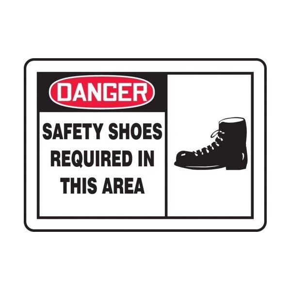 Accuform Danger Sign, DANGER Header, TextSymbol Legend, SAFETY SHOES REQUIRED IN THIS AREA GRAPHIC Legend, 0055 in Plastic, 10 in Height, 14 in Width, RedBlack on white LegendBackgroundSafety Signs identify and indicate potential, type and degree of hazards that may lead to accidental injury or property damage Plastic signs are semiflexible, made with 50 recycled content and ideal for indoor and shortterm, sheltered outdoor environments Plastic signs feature good impact resistance, UV inhibitors and enough flex to mount on slightly curved areas