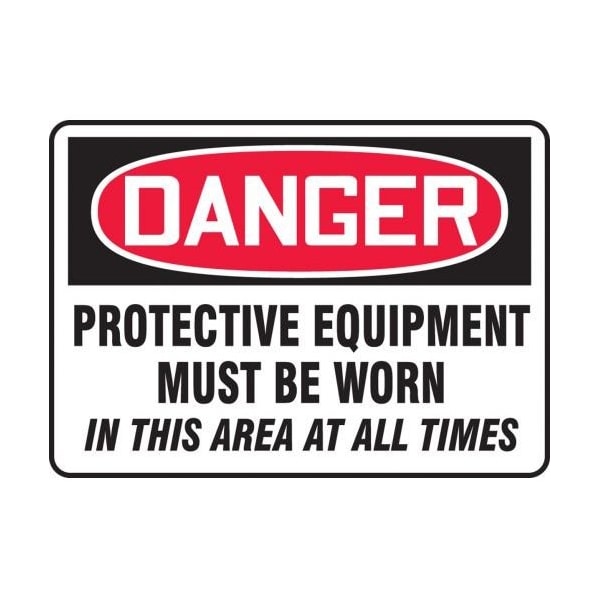 Accuform Danger Sign, Header DANGER, Text Legend, Legend PROTECTIVE EQUIPMENT MUST BE WORN IN THIS AREA AT ALL TIMES, 0055 in Plastic, 10 in Height, 14 in Width, RedBlack on white LegendBackgroundSafety Signs identify and indicate potential, type and degree of hazards that may lead to accidental injury or property damage Plastic signs are semiflexible, made with 50 recycled content and ideal for indoor and shortterm, sheltered outdoor environments Plastic signs feature good impact resistance, UV inhibitors and enough flex to mount on slightly curved areas