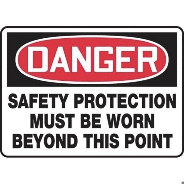 Accuform Danger Sign, Header DANGER, Text Legend, Legend SAFETY PROTECTION MUST BE WORN BEYOND, 0055 in Plastic, 10 in Height, 14 in WidthSafety Signs identify and indicate potential, type and degree of hazards that may lead to accidental injury or property damage Plastic signs are semiflexible, made with 50 recycled content and ideal for indoor and shortterm, sheltered outdoor environments Plastic signs feature good impact resistance, UV inhibitors and enough flex to mount on slightly curved areas