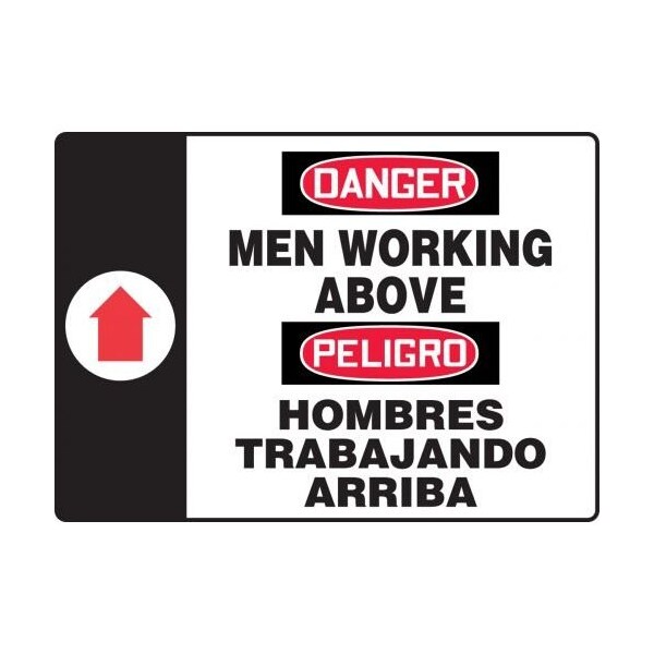 Accuform Danger Sign, DANGER Header, TextSymbol Legend, DANGER MEN WORKING ABOVEPELIGRO HOMBRES TRABAJANDO ARRIBA ARROW UP Legend, 4 mil Adhesive Vinyl, Surface Mounting, 14 in Height, 10 in Width, RedBlack on white LegendBackgroundSafety Signs identify and indicate potential, type and degree of hazards that may lead to accidental injury or property damage Adhesive Vinyl is the ideal choice for a variety of indoor and sheltered outdoor, marking needs Easily mounts to all curved areas such as pipes, poles and secondary containers Adhesive Vinyl signs feature a printed matte surface, moistureresistance and scored backing for quick peeloff and application