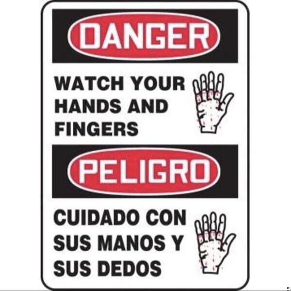 Accuform Danger Sign, Bilingual, DANGER Header, TextSymbol Legend, DANGER WATCH YOUR HANDS AND FINGERSPELIGRO CUIDADO CON SUS MANOS Y SUS DEDOS WGRAPHIC Legend, 004 in Aluminum, 14 in Height, 10 in WidthSafety Signs identify and indicate potential, type, and degree of hazards that may lead to accidental injury or property damage Aluminum signs withstand washdowns, harsh elements, abusive conditions, and feature good chemical, abrasion, and impact resistance Aluminum is excellent for indoor and outdoor usage, making it ideal for a wide variety of industrialstrength applications
