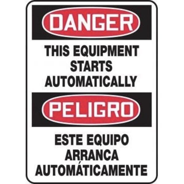 Accuform Danger Sign, Header DANGER, Text Legend, Legend DANGER THIS EQUIPMENT STARTS AUTOMATICALLYPELIGRO ESTE EQUIPO ARRANCA AUTOMATICAMENTE, 6 mil Adhesive DuraVinyl, 14 in Height, 10 in WidthSafety Signs identify and indicate potential, type and degree of hazards that may lead to accidental injury or property damage Duallayered Adhesive DuraVinyl delivers exceptional flexibility and performance, outperforming standard vinyl Printed image is protected by a highgloss UV protective coating Adhesive DuraVinyl is durable, even in the toughest indoor and outdoor conditions and adheres to most smooth, curved and irregular surfaces