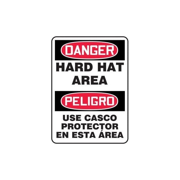 Accuform Danger Sign, Bilingual, Header DANGER, Text Legend, Legend DANGER HARD HAT AREAPELIGRO USE CASCO PROTECTOR EN ESTA AREA, 004 in Aluminum, 14 in Height, 10 in Width, RedBlack on white LegendBackgroundSafety Signs identify and indicate potential, type, and degree of hazards that may lead to accidental injury or property damage Aluminum signs withstand washdowns, harsh elements, abusive conditions, and feature good chemical, abrasion, and impact resistance Aluminum is excellent for indoor and outdoor usage, making it ideal for a wide variety of industrialstrength applications