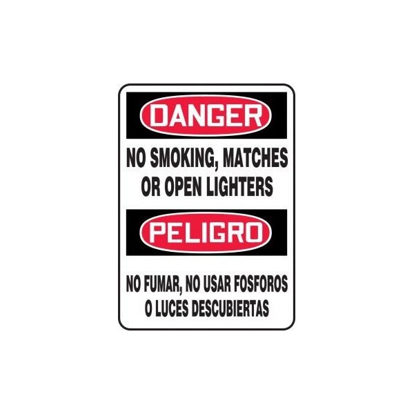Accuform Danger Sign, Bilingual, Header DANGERPELIGRO, Text Legend, Legend NO SMOKING, MATCHES OR OPEN LIGHTERSNO FUMAR, NO USAR FOSFOROS O LUCES DESCUBIERTAS, 4 mil Adhesive Vinyl, Adhesive Surface Mounting, 14 in Height, 10 in Width, WhiteBlackRed LegendBackgroundSafety Signs identify and indicate potential, type and degree of hazards that may lead to accidental injury or property damage Adhesive Vinyl is the ideal choice for a variety of indoor and sheltered outdoor, marking needs Easily mounts to all curved areas such as pipes, poles and secondary containers Adhesive Vinyl signs feature a printed matte surface, moistureresistance and scored backing for quick peeloff and application