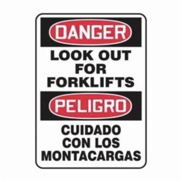 Accuform Danger Sign, Bilingual, Header DANGER, Text Legend, Legend DANGER LOOK OUT FOR FORKLIFTSPELIGRO CUIDADO CON LOS MONTACARGAS, 6 mil Adhesive DuraVinyl, 14 in Height, 10 in WidthSafety Signs identify and indicate potential, type, and degree of hazards that may lead to accidental injury or property damage Duallayered Adhesive DuraVinyl delivers exceptional flexibility and performance, outperforming standard vinyl Printed image is protected by a highgloss UV protective coating Adhesive DuraVinyl is durable, even in the toughest indoor and outdoor conditions, and adheres to most smooth, curved, and irregular surfaces