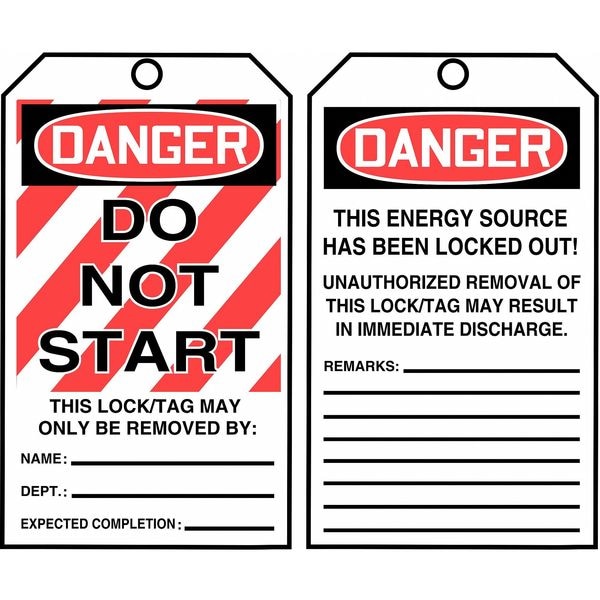 Danger Tag By The Roll, Material Cardstock, Legend Do Not Start, Height 6-1/4 In., Width 3 In., Hole Size 3/8 In., Header Danger, Legend Color Black, Background Color Red, White, Legend Style Text, Write on Surface Yes, Package Quantity 100