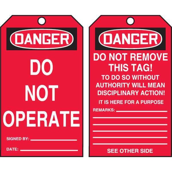 Danger Tag By The Roll, Subject Matter General Safety, Sign Legend Do Not Operate, Legend Same on Both Sides No, Sign Header Danger, Sign Header Background Color Black, Red, Tag Style Single Part, Shape Rectangular, Safety Tag Legend - Back Side Do Not Remove This Tag!, Sign Header -Back Side Danger, Package Quantity 250