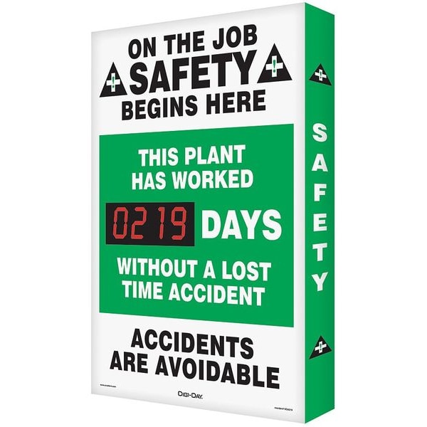 Electronic Safety Scoreboard, Sign Legend On The Job Safety Begins Here This Plant Has Worked ___ Days Without A Lost Time Accident Accidents Are Avoidable, English, Height 28 in, Width 20 in, Vertical Rectangle, Background Color White, Number of Displays 1, Display Format Number of Days