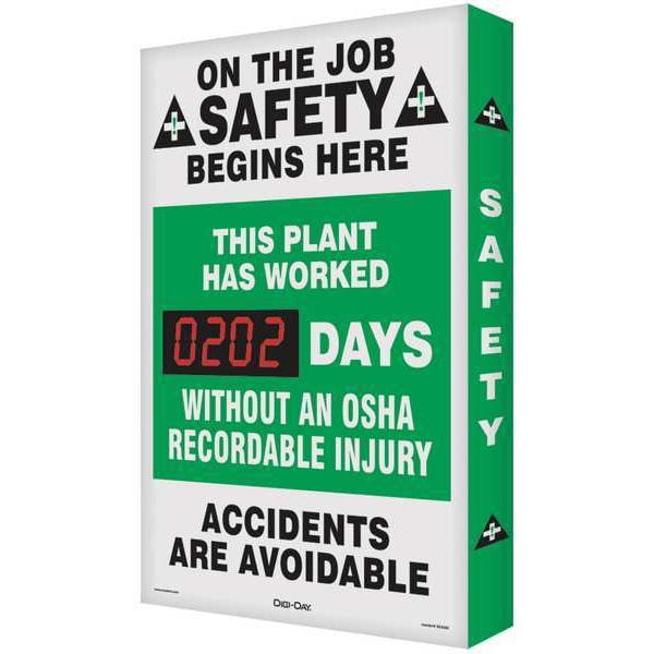 Electronic Safety Scoreboard, Sign Legend On The Job Safety Begins Here, This Plant Has Worked ___ Days Without An Osha Recordable Injury, Accidents Are Avoidable, English, Height 28 in, Width 20 in, Vertical Rectangle, Background Color White, Number of Displays 1, Display Format Number of Days
