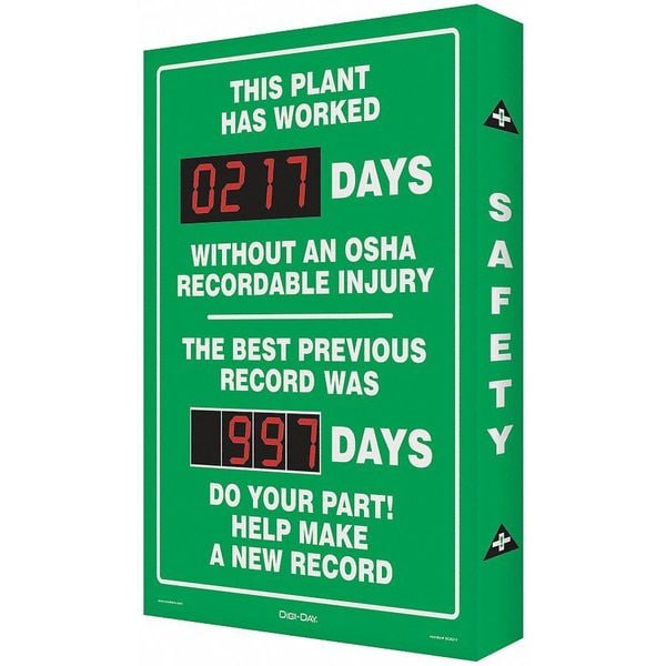 Electronic Safety Scoreboard, Sign Legend This Plant Has Worked __ Days Without An OSHA Recordable Injury The Best Previous Record Was __ Days Do Your Part! Help Make A New Record, English, Height 28 in, Width 20 in, Vertical Rectangle, Background Color Green, Number of Displays 1, Display Format Number of Days
