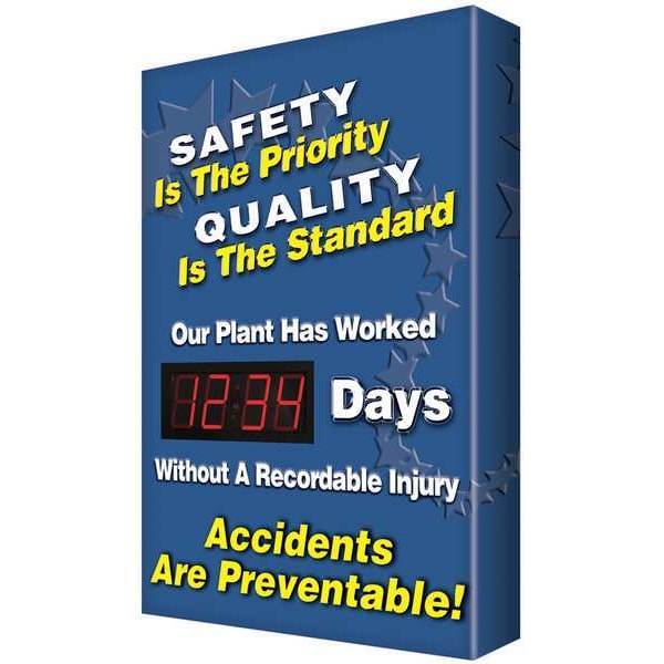 Electronic Safety Scoreboard, Sign Legend Safety Is The Priority Quality Is The Standard Our Plant Has Worked __ Days Without A Recordable Injury Accidents Are Preventable!, English, Height 28 in, Width 20 in, Vertical Rectangle, Background Color Blue, Number of Displays 1, Display Format Number of Days
