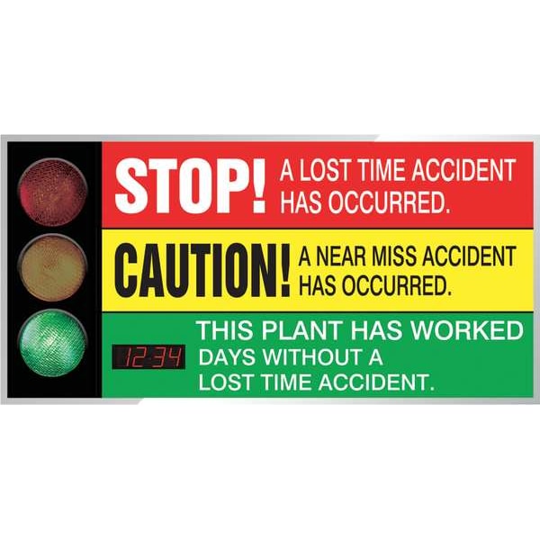 Electronic Safety Scoreboard, Sign Legend Stop! A Lost Time Accident Has Occurred. Caution! A Near Miss Accident Has Occurred. This Plant Has Worked __ Days Without A Lost Time Accident., English, Height 36 in, Width 72 in, Horizontal Rectangle, Background Color Green, Red, Yellow, Number of Displays 1, Display Format Number of Days