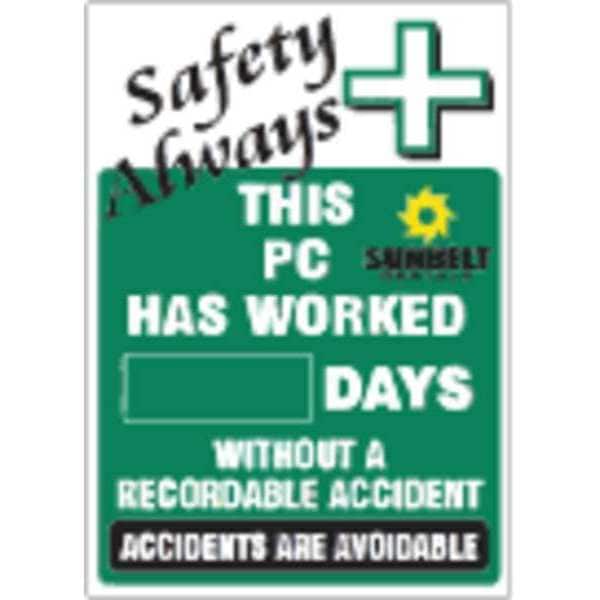 Electronic Scoreboard,This PC has Worked, Sign Legend Safety First, This PC Has Worked ___ Days Without A Recordable Accident, Accidents Are Avoidable, English, Height 28 in, Width 20 in, Vertical Rectangle, Background Color White, Number of Displays 1, Display Format Number of Days