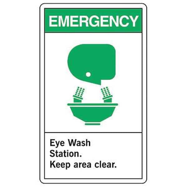 First Aid Sign, Sign Subject Matter Eyewash and Shower, Height 14 In., Width 10 In., Sign Material Vinyl, Sign Mounting Style Adhesive Surface, Header No Header, Legend Emergency Eye Wash Station. Keep Area Clear., Printed Language English, Sign Shape Rectangle