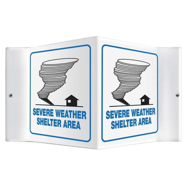 Emergency Sign, Sign Subject Matter Evacuation, Assembly or Shelter, Height 6 in, Width 8 1/2 in, Sign Material Plastic, Sign Mounting Style With Mounting Holes, V-Shaped, Header No Header, Legend Severe Weather Shelter Area, Printed Language English, Sign Shape V-Shaped