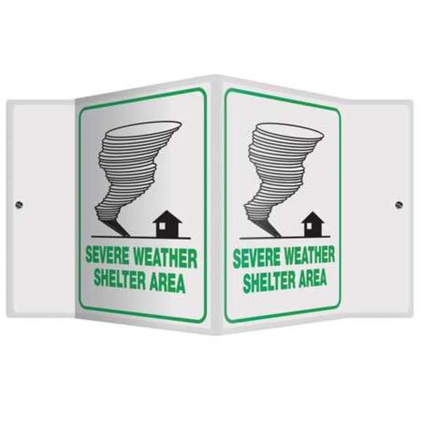 Emergency Sign, Sign Subject Matter Evacuation, Assembly or Shelter, Height 6 in, Width 8 1/2 in, Sign Material Plastic, Sign Mounting Style With Mounting Holes, V-Shaped, Header No Header, Legend Severe Weather Shelter Area, Printed Language English, Sign Shape V-Shaped