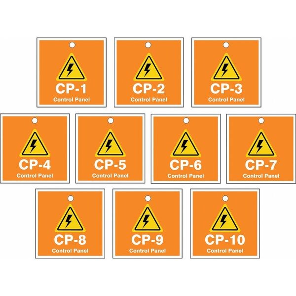 Energy Source ID Tag, Material Plastic, Legend CP-(1 to 10) Control Panel, Height 2-1/2 In., Width 2-1/2 In., Withstand Pull Force 50 lb, Hole Size 3/16 In., Header No Header, Legend Color Orange, Background Color White, Legend Style Symbol and Text, Write on Surface No, Package Quantity 10