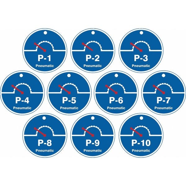 Energy Source ID Tag, Material Plastic, Legend P-(1 to 10) Pneumatic, Height 2-1/2 In., Width 2-1/2 In., Withstand Pull Force 50 lb, Hole Size 3/16 In., Header No Header, Legend Color White, Background Color Blue, Legend Style Symbol and Text, Write on Surface No, Package Quantity 10
