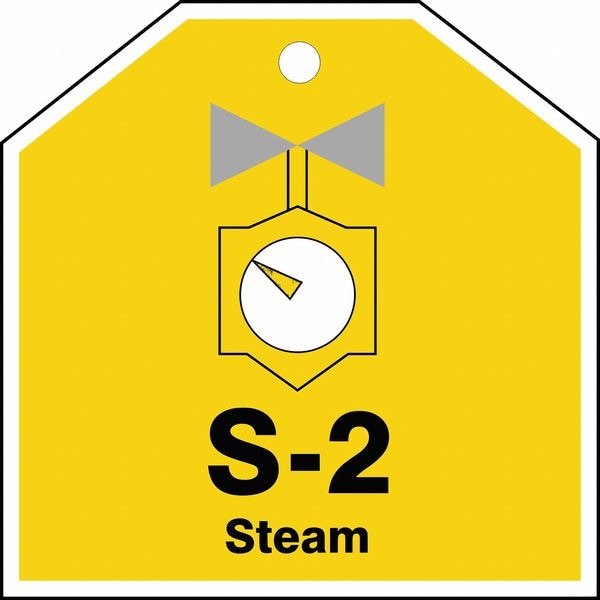 Energy Source ID Tag, Material Plastic, Legend S-2 Steam, Height 2-1/2 In., Width 2-1/2 In., Withstand Pull Force 50 lb, Hole Size 3/16 In., Header No Header, Legend Color Black, Background Color Yellow, Legend Style Symbol and Text, Write on Surface No