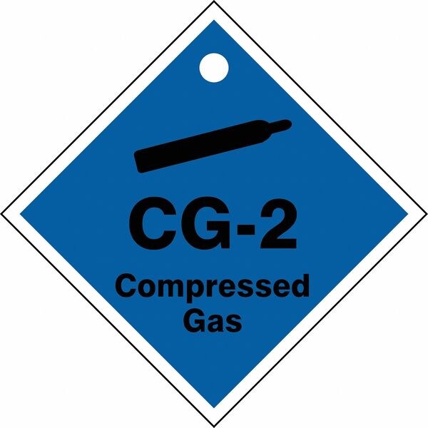 Energy Source ID Tag, Material Plastic, Legend CG-2 Compressed Gas, Height 2-1/2 In., Width 2-1/2 In., Withstand Pull Force 50 lb, Hole Size 3/16 In., Header No Header, Legend Color Black, Background Color Blue, Legend Style Symbol and Text, Write on Surface No