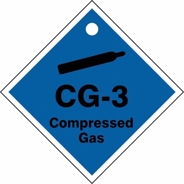 Energy Source ID Tag, Material Plastic, Legend CG-3 Compressed Gas, Height 2-1/2 In., Width 2-1/2 In., Withstand Pull Force 50 lb, Hole Size 3/16 In., Header No Header, Legend Color Black, Background Color Blue, Legend Style Symbol and Text, Write on Surface No
