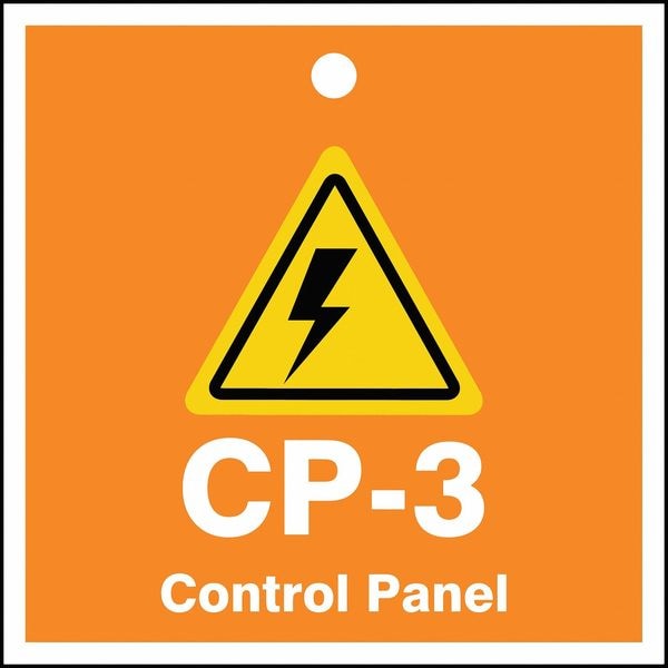 Energy Source ID Tag, Material Plastic, Legend CP-3 Control Panel, Height 2-1/2 In., Width 2-1/2 In., Withstand Pull Force 50 lb, Hole Size 3/16 In., Header No Header, Legend Color Orange, Background Color White, Legend Style Symbol and Text, Write on Surface No