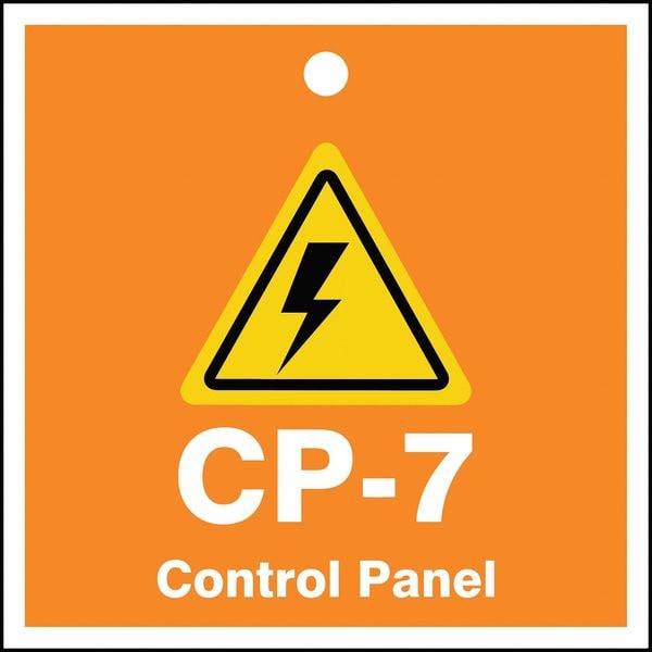 Energy Source ID Tag, Material Plastic, Legend CP-7 Control Panel, Height 2-1/2 In., Width 2-1/2 In., Withstand Pull Force 50 lb, Hole Size 3/16 In., Header No Header, Legend Color Orange, Background Color White, Legend Style Symbol and Text, Write on Surface No