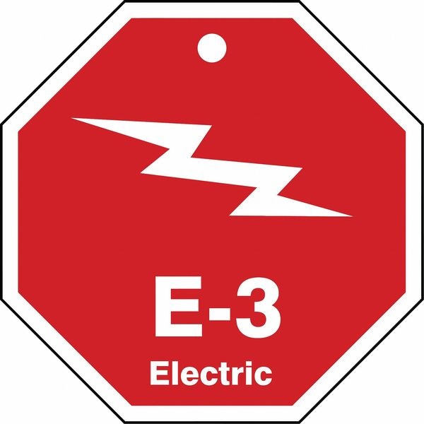 Energy Source ID Tag, Material Plastic, Legend E-3 Electric, Height 2-1/2 In., Width 2-1/2 In., Withstand Pull Force 50 lb, Hole Size 3/16 In., Header No Header, Legend Color White, Background Color Red, Legend Style Symbol and Text, Write on Surface No