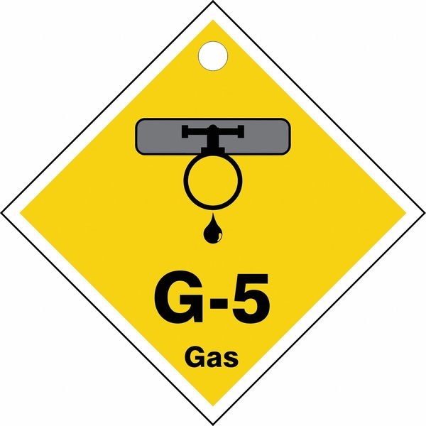 Energy Source ID Tag, Material Plastic, Legend G-5 Gas, Height 2-1/2 In., Width 2-1/2 In., Withstand Pull Force 50 lb, Hole Size 3/16 In., Header No Header, Legend Color Black, Background Color Yellow, Legend Style Symbol and Text, Write on Surface No