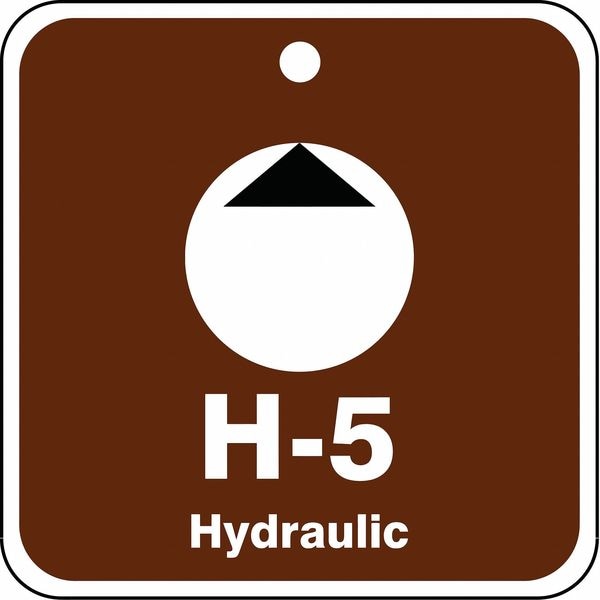 Energy Source ID Tag, Material Plastic, Legend H-5 Hydraulic, Height 2-1/2 In., Width 2-1/2 In., Withstand Pull Force 50 lb, Hole Size 3/16 In., Header No Header, Legend Color White, Background Color Brown, Legend Style Symbol and Text, Write on Surface No