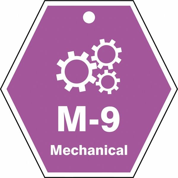 Energy Source ID Tag, Material Plastic, Legend M-9 Mechanical, Height 2-1/2 In., Width 2-1/2 In., Withstand Pull Force 50 lb, Hole Size 3/16 In., Header No Header, Legend Color White, Background Color Purple, Legend Style Symbol and Text, Write on Surface No