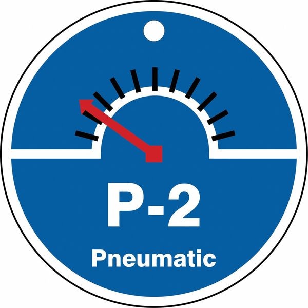 Energy Source ID Tag, Material Plastic, Legend P-2 Pneumatic, Height 2-1/2 In., Width 2-1/2 In., Withstand Pull Force 50 lb, Hole Size 3/16 In., Header No Header, Legend Color White, Background Color Blue, Legend Style Symbol and Text, Write on Surface No