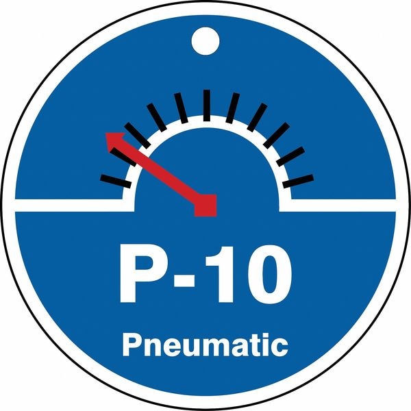 Energy Source ID Tag, Material Plastic, Legend P-10 Pneumatic, Height 2-1/2 In., Width 2-1/2 In., Withstand Pull Force 50 lb, Hole Size 3/16 In., Header No Header, Legend Color White, Background Color Blue, Legend Style Symbol and Text, Write on Surface No