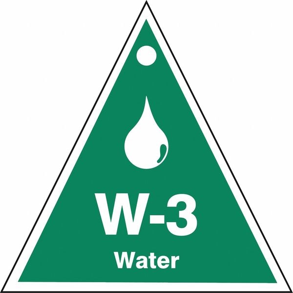 Energy Source ID Tag, Material Plastic, Legend W-3 Water, Height 2-1/2 In., Width 2-1/2 In., Withstand Pull Force 50 lb, Hole Size 3/16 In., Header No Header, Legend Color White, Background Color Green, Legend Style Symbol and Text, Write on Surface No