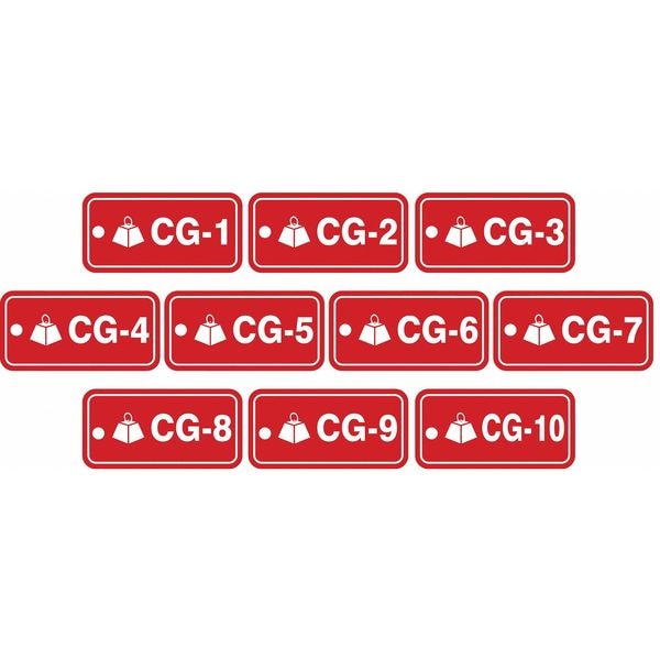 Energy Source ID Tag, Material Plastic, Legend CG-(1 to 10), Height 1-1/2 In., Width 3 In., Withstand Pull Force 50 lb, Hole Size 3/16 In., Header No Header, Legend Color White, Background Color Red, Legend Style Symbol and Text, Write on Surface No, Package Quantity 10