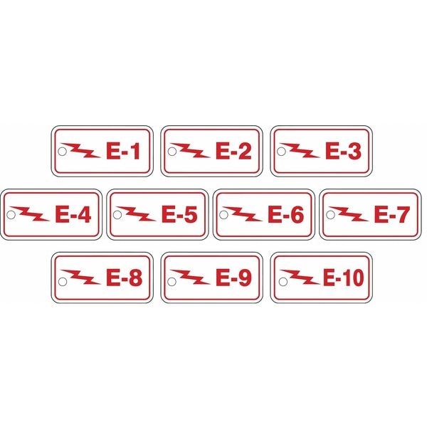 Energy Source ID Tag, Material Plastic, Legend E-(1 to 10), Height 1-1/2 In., Width 3 In., Withstand Pull Force 50 lb, Hole Size 3/16 In., Header No Header, Legend Color Red, Background Color White, Legend Style Symbol and Text, Write on Surface No, Package Quantity 10