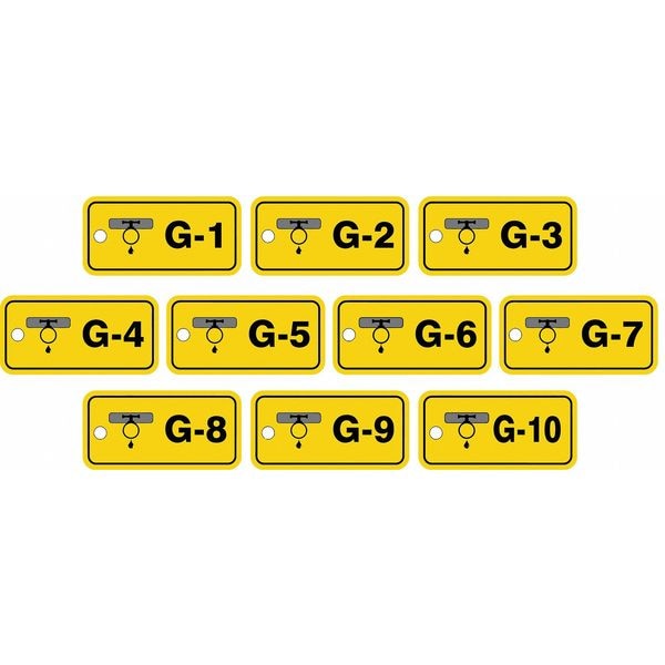 Energy Source ID Tag, Material Plastic, Legend G-(1 to 10), Height 1-1/2 In., Width 3 In., Withstand Pull Force 50 lb, Hole Size 3/16 In., Header No Header, Legend Color Black, Background Color Yellow, Legend Style Symbol and Text, Write on Surface No, Package Quantity 10