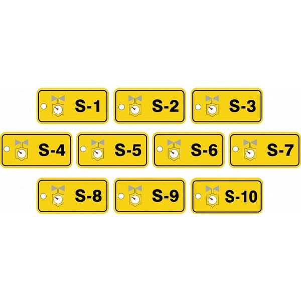 Energy Source ID Tag, Material Plastic, Legend S-(1 to 10), Height 1-1/2 In., Width 3 In., Withstand Pull Force 50 lb, Hole Size 3/16 In., Header No Header, Legend Color Black, Background Color Yellow, Legend Style Symbol and Text, Write on Surface No, Package Quantity 10